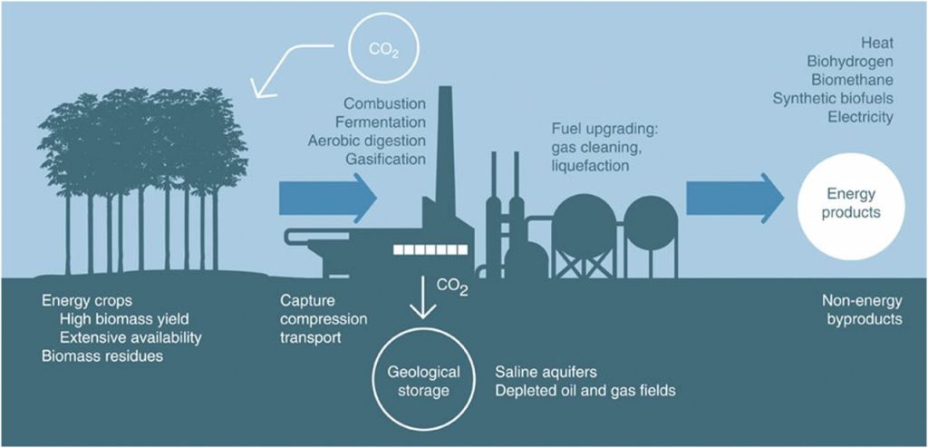 La bioénergie avec captage et stockage du carbone (abrégé BECCS pour Bio-Energy with Carbon Capture and Storage ) consiste à cultiver à grande échelle des plantes à croissance rapide, puis à les brûler soit pour produire des biocarburants, remplaçant au passage les combustibles fossiles ayant la même utilité, soit pour directement produire de l’électricité. Le CO2 libéré au cours du processus est alors capté par des systèmes d’épuration et injecté profondément sous terre, généralement dans des formations rocheuses poreuses. Cela permet de séquestrer une partie du CO2 collecté par les plantes lors de la photosynthèse, tandis que le reste est utilisé pour créer du biocarburant et de l’électricité neutre en carbone. En théorie, cela permet donc à un système de BECCS d’atteindre des émissions nettes négatives (c’est à dire de retirer du CO2 de l’atmosphère), tout en restant économiquement viable grâce à la vente de biocarburants et d’énergie électrique.